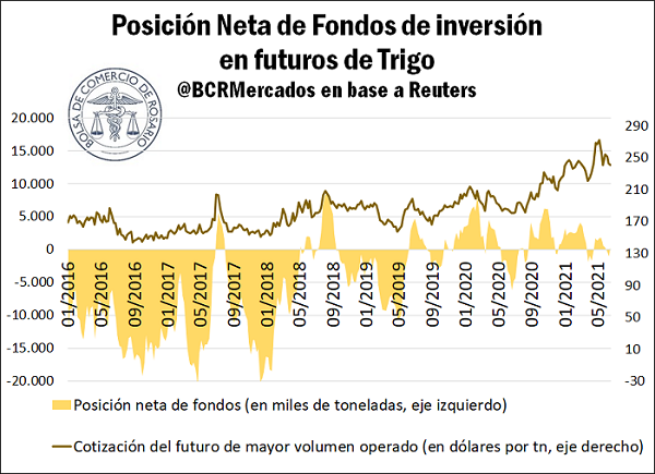 En perspectiva con los últimos años, el 2021 viene con tenues oscilaciones en lo que hace al posicionamiento neto de los fondos en futuros de trigo en Chicago, al menos hasta mediados de junio. La importante baja en el posicionamiento neto a mediados del mes pasado tuvo su consecuente impacto en las cotizaciones en el mercado de referencia estadounidense, tanto para el trigo como para los principales commodities globales.