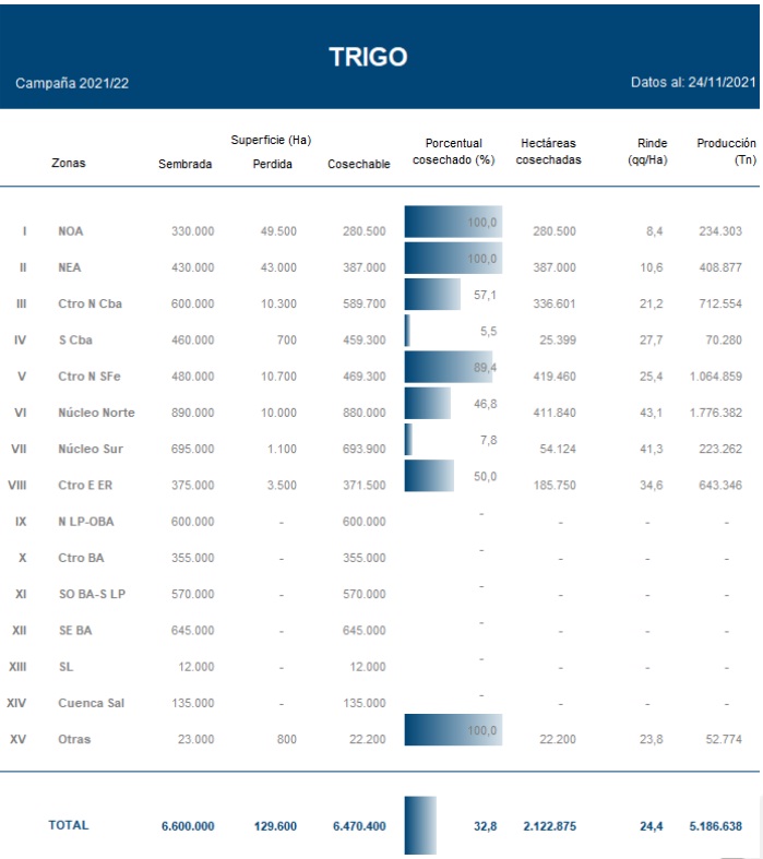 Sobre el centro del área agrícola, en el Centro-Norte de Córdoba y Santa Fe, Centro-Este de Entre Ríos y Núcleo Norte, la cosecha alcanzó progresos intersemanales de entre 30 y 40 puntos porcentuales. Los rindes en estas regiones presentan gran variabilidad (entre 7 y 73 qq/ha) dependiendo de la disponibilidad de humedad y las dosis de fertilización, sin embargo, los promedios se ubican entre 4 y 8 qq/Ha por encima de los estimados inicialmente, explica en gran medida el actual ajuste en la proyección de producción.