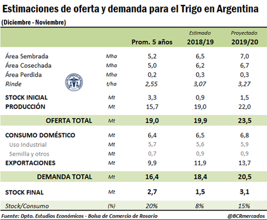 Entre los datos más relevantes para el mercado del trigo, está el aumento en la estimación de los stocks finales globales para el ciclo 2019/20 que alcanzarían 294,3 millones de toneladas y se convertirían en un nuevo récord de existencias. El crecimiento de estos stocks se debe a un aumento en el nivel de existencias iniciales del ciclo y de una mayor producción. Por el lado de la demanda, si bien hay también un aumento en el uso del cereal a nivel mundial, este no compensaría la suba de la oferta y entonces resultaría en stocks finales crecientes.