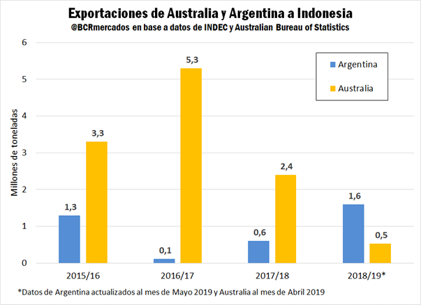 Indonesia abastecía típicamente el 55% de su demanda externa de trigo con mercadería australiana, pero con las sucesivas sequías que golpearon a Australia el cereal australiano perdió terreno en el codiciado mercado indonesio. En la campaña australiana 2018/19, que está cercana a finalizar el próximo septiembre, el país exportó a Indonesia un 78% menos que el ciclo anterior. Más aún, los despachos registrados este ciclo son sólo una décima parte de las exportaciones a Indonesia en la campaña 2016/17.