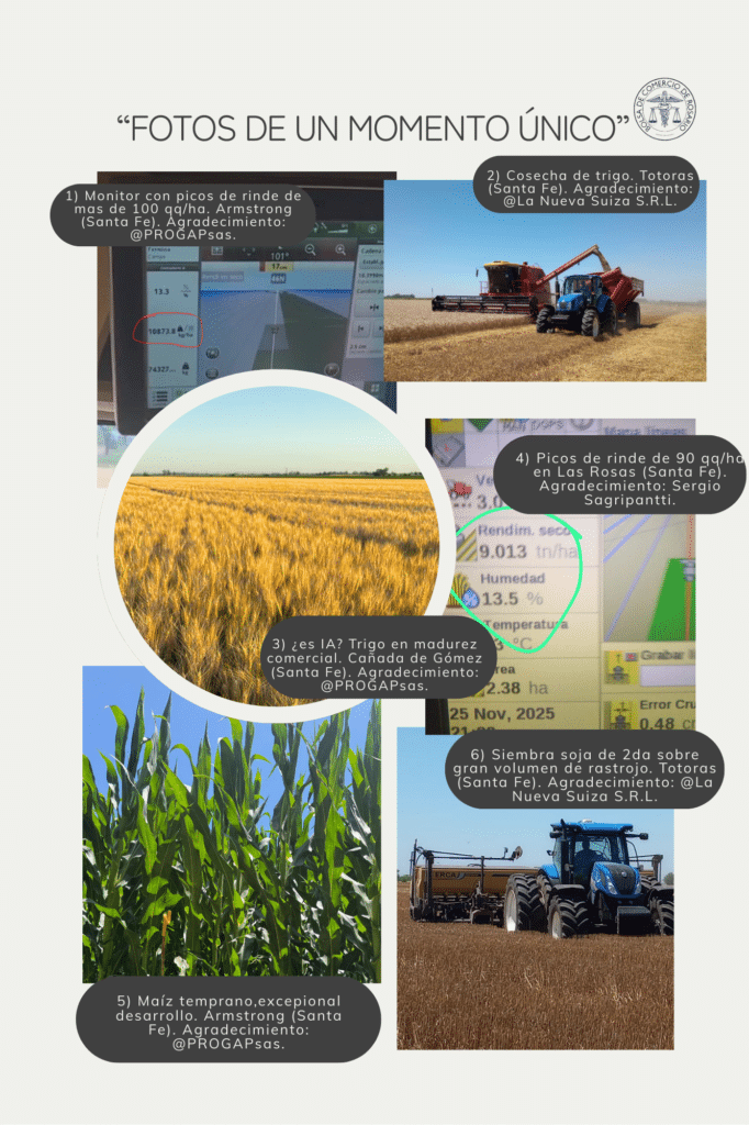 Las imágenes que productores y asesores comparten muestran monitores explotando de altos rindes y trigos con un desarrollo tan uniforme que parecen irreales. En Cañada de Gómez esperan superar los 70 qq/ha en lotes que hasta “parecen generados por IA”. El abundante rastrojo, producto directo de estos rindes excepcionales, también plantea desafíos para la siembra de soja de segunda, que requiere horarios más secos para evitar que los equipos se traben en la humedad del residuo.