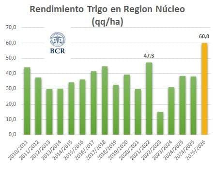 El avance de la cosecha de trigo en la región núcleo confirma un ciclo histórico: con el 40% del área trillada, el rinde promedio alcanza los 60 qq/ha y en varias localidades se registran picos de hasta 110 qq/ha. Mientras el maíz temprano muestra un desarrollo excepcional y algunos técnicos ya hablan de un piso asegurado, las próximas lluvias serán claves para consolidar el potencial de todos los cultivos.