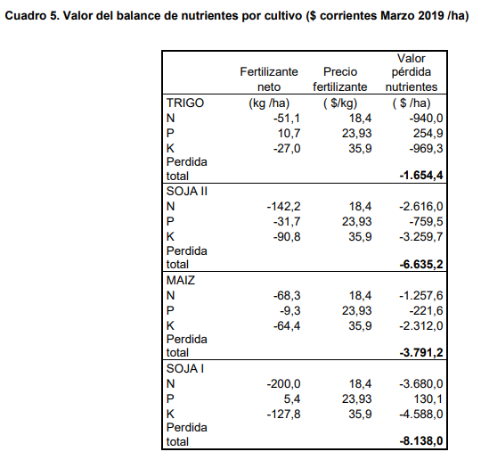 Considerando el pago de un alquiler de 18 quintales de soja /hectárea para el doble cultivo y prorrateando 9 q /ha en el costo de trigo se muestra que, mientras el productor propietario requiere 1,6 t /ha para cubrir los costos de implantación y protección, el rinde de indiferencia para el contratista es de 3,45 t/ha, que casi iguala el valor de productividad media zonal. Esto es indicativo del mayor riesgo asociado a la alternativa de la modalidad de alquiler en valores fijos de producción en lugar de opciones de reparto del riesgo asociadas a pago en porcentaje de la producción. Es de importancia también evaluar la sustentabilidad agronómica de la actividad, para ello se agregó en el análisis el cálculo del valor del balance de nutrientes (VBN), según tablas (IPNI, 2019) para los rendimientos utilizados (Cuadro 5)