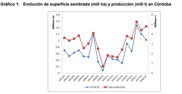 En el gráfico 2 se detallan los cambios en el rinde provincial y en una zona ecológicamente más favorable para este cereal (Departamento Marcos Juárez).