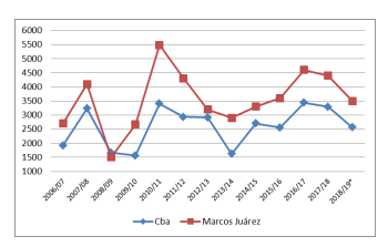 El cultivo de trigo mantiene en el último quinquenio la participación destacada que tenía históricamente en la provincia como opción rentable entre los cultivos agrícolas pampeanos: en el gráfico 1 se muestra la evolución de la superficie sembrada y producción de trigo a nivel de Córdoba desde 2001 (Ministerio de Agroindustria, 2019). Se observa una importante variación entre valores extremos presentando un valor mínimo cercano a trescientas mil toneladas en el ciclo 2009/10 (por problemas climáticos a la siembra y dificultades en la comercialización externa) mientras que el máximo de producción es de cinco millones de toneladas en 2016/17 (favorecido por la eliminación de retenciones y la devaluación de fines de 2015). En el ciclo 2018/19 se muestra una baja mayor en la producción respecto a la superficie sembrada (por déficit hídricos en el ciclo del cereal) pero se mantiene la oferta entre los mayores valores de la serie. Así, la producción promedio en el último trienio superó en un 82 % al valor medio de la serie de las últimas dieciocho campañas.