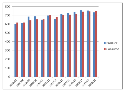 Se observa una tendencia de incremento en ambas variables, de este modo la producción entre extremos de la serie sube un 23 % mientras que el consumo lo hace en un 20 %. En los últimos seis ciclos se muestra que en cinco la producción supera al consumo anual con lo que se incrementan los stocks finales. Esta situación cambia en el último ciclo 2019/20 en que baja la oferta respecto al consumo con la consiguiente disminución en el stock. Esto se muestra en el gráfico 4.