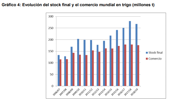 Del gráfico surge que ambas variables se incrementan aunque en distinta escala, de tal forma mientras que el comercio lo hace en 53 % entre extremos el stock final aumenta el 103%. Por ello esto produce una tendencia hacia la baja en los precios esperados ante el aumento del stock en las seis campañas hasta la 2018/19 en que presenta una leve baja, a su vez se observa también el estancamiento del comercio mundial. En el gráfico 5 se muestra la evolución de la relación stock final /consumo.