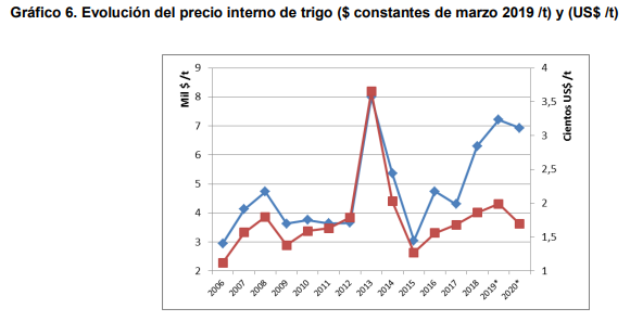 Gráfico 7: Precio esperado a cosecha en trigo (US$ /t), ciclo 2019/20