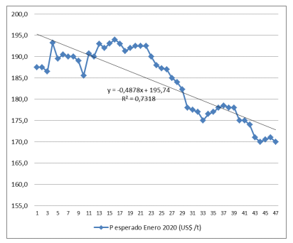 El valor extremo del precio en el 2013/14 fue coyuntural, producido por el déficit de oferta interna por las políticas sectoriales vigentes en esa época, lo cual se subsanó en las campañas siguientes de alta oferta y consiguiente baja del precio. En 2016 se produjo la eliminación de los impuestos a la exportación, por ello la suba en dicho año que no fue más pronunciada debido a la alta oferta mundial. La situación de la producción mundial tiene una tendencia a la suba en los últimos seis ciclos con lo que, a pesar de mejoras en el consumo, la relación stock /consumo pasó de 26,2 % en 2012/13 a 36,2 % en 2017/18 y 36% en 2019/20 lo que mantiene un contexto de baja en el precio esperado que se compensa por la suba del tipo de cambio en 2018 y el primer bimestre de 2019. Esto se observa en el eje derecho del gráfico 6 donde el valor en US$ /t se diferencia en los últimos años de la curva en $ debido a la mayor devaluación del peso, con lo que aumentos leves en US$ significaron variaciones mayores expresadas en moneda local. Esto se ve desde 2018 en adelante. En el gráfico 7 se muestra la evolución del precio esperado para enero 2020 desde que comenzó a cotizar la posición en enero 2019 (MATBA, 2019). Cabe mencionar que, a diferencia de años anteriores, solo después de la cosecha 2018/19 en el mercado de futuros empezó a cotizar esta posición posiblemente por la incertidumbre conjunta de la evolución del comercio de granos ante escenarios de discusiones arancelarias en el mercado mundial y las expectativas de la política cambiaria local.