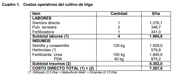 Se realizó el cálculo de márgenes económicos siguiendo el esquema tradicional (Gonzalez y Pagliettini, 2006) para evaluar los resultados actuales con respecto a los del año anterior comparando las opciones de cultivos competitivos (maíz y soja de primera) con los precios promedio esperados a cosecha del nuevo ciclo 2019/20 proyectados en la primera quincena de marzo 2019 (Mercado a Término Bs.As, 2019) y los precios de insumos en ese momento (Márgenes Agropecuarios, 2019). A su vez, se consideraron los rendimientos del promedio del último quinquenio del departamento Marcos Juárez (Ministerio de Agroindustria, 2019). De esta forma se evaluó al trigo como integrante de la rotación con soja de segunda, con respecto a maíz o soja de primera siembra comparando a su vez la situación del productor propietario de la tierra y la opción del productor contratista. Posteriormente se agregó al análisis la consideración de aspectos ambientales mediante el esquema de cálculo de balance de nutrientes para determinar los cambios en los resultados económicos (Ghida Daza, 2018) y finalmente, se indican las expectativas del cultivo para el nuevo ciclo.