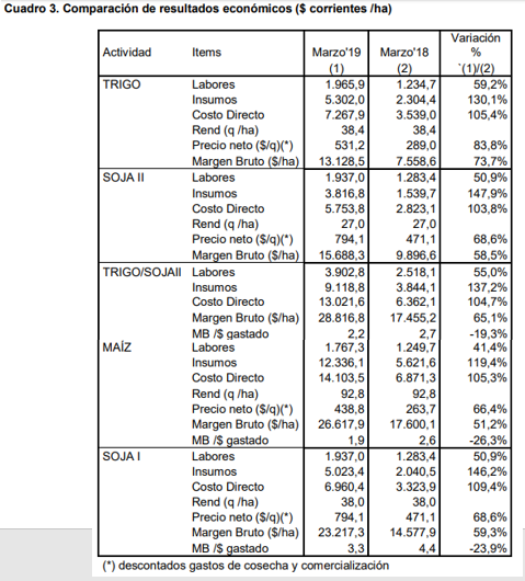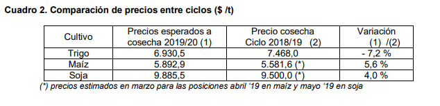 Estos valores representan un aumento del 59 % en el componente labores y del 130 % en insumos con respecto al anterior informe de marzo 2018, lo que da una variación del Costo Directo total de 105 %, teniendo en cuenta que, la variación de precios mayorista (INDEC, 2019) en el período se estima en 64 % surge un incremento del costo directo en términos reales. En el cuadro 2 se comparan las primeras estimaciones de los precios esperados a cosecha 2019/20 (considerando el promedio primera quincena de marzo 2019), con respecto a los precios en cosecha en el actual ciclo 2018/19.