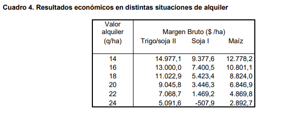 Teniendo en cuenta la situación teórica, considerando rindes promedio quinquenales, surge un comportamiento homogéneo en los cultivos de suba de los indicadores, tanto de costos como de ingresos y márgenes. Teniendo en cuenta la devaluación del 100% entre períodos que provocó el incremento del índice de precios mayorista (IPIM) del 64% en el período se puede mencionar que los costos directos se incrementaron en forma similar a la variación del dólar, especialmente por el componente insumos (agroquímicos y semilla) y algo menos en labores. Por su parte, los precios netos en chacra aumentaron en forma similar al índice de precios excepto en trigo donde se dio un incremento real del 20%. Esto hace que el trigo presente el mejor incremento de su precio en chacra y también de margen entre los cultivos, por ello, el margen de trigo en la alternativa de doble cultivo trigo /soja de segunda mejora en mayor proporción a los cultivos de verano. También el doble cultivo de trigo /soja de segunda muestra la menor baja en el indicador financiero de margen por peso gastado lo que lo hace una alternativa competitiva respecto a las otras opciones de cultivos de verano. Considerando que una importante proporción de la agricultura se realiza en tierra alquilada, se elaboró el cuadro 4 en que se presentan los márgenes, con rindes promedios, logrados por productores con este tipo de contratos según distintos valores de alquiler.
