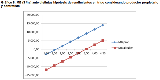Del cuadro surge que el trigo, en combinación con soja de segunda, supera a las otras opciones presentando el doble cultivo, a su vez, menor riesgo respecto a soja de primera o maíz. La alternativa de alquiler se puede analizar también, en el gráfico 8, considerando el margen obtenido en distintas hipótesis de rendimiento (eje horizontal).