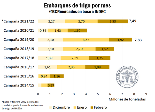 De cumplirse las previsiones de embarques para el mes de febrero y en sintonía con los valores de exportación del trigo, estaríamos ante el primer trimestre de mayores exportaciones en valor para una campaña de trigo. De esta manera, la campaña 2021/22 superaría los US$ 2.092 millones y desbancaría al récord de US$ 2.074 millones del año comercial 2007/08.