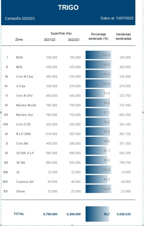 En la última semana se relevó un progreso de siembra de 5,5 puntos porcentuales, alcanzando a incorporar el 90,7 % de las 6,2 MHa proyectadas para la campaña en curso. La limitada oferta hídrica superficial provocó importantes demoras en el avance de las sembradoras sobre sectores del centro y sur del área agrícola. Las labores se concentraron en lotes donde se dispone de humedad para asegurar la emergencia, e incluso en seco a la espera de lluvias en el corto plazo. No obstante, ante los inciertos pronósticos, no se descartan nuevos ajustes sobre la proyección de área.