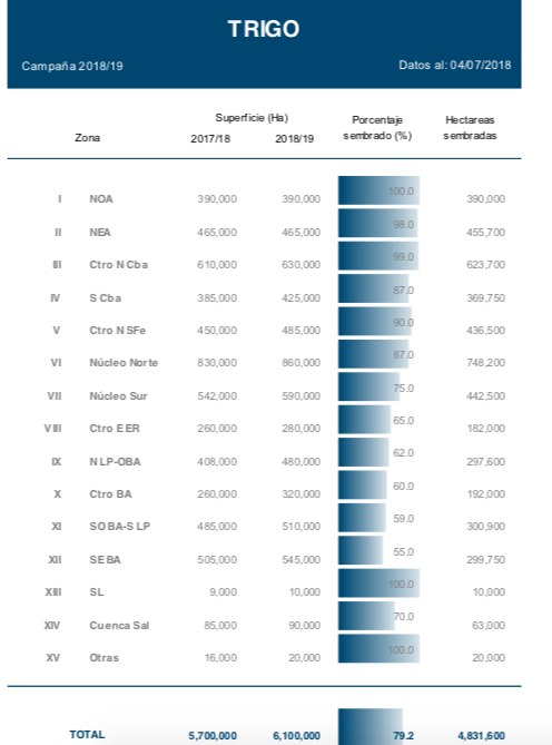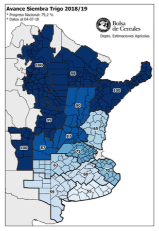 La siembra de trigo alcanzó el 79,2 % de las 6.100.000 hectáreas proyectadas para la actual campaña. Los mayores progresos de siembra se relevaron sobre las regiones del centro y sur del área agrícola nacional, mientras que en el norte del país restan los últimos lotes por implantar. En números absolutos se incorporaron más de 4,8 millones de hectáreas con un adelanto interanual de 6,5 puntos porcentuales. En cuanto al crecimiento y desarrollo del cereal, se relevaron los primeros lotes en etapa de espigazón bajo una condición de cultivo entre normal y regular.