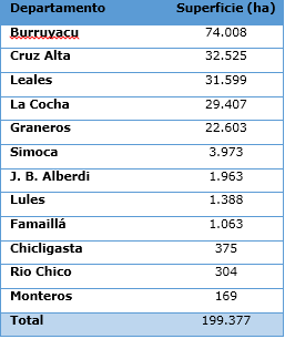 El departamento con mayor superficie del cultivo es Burruyacú con 74.008 ha, ocupando el 37% del total provincial. Le siguen Cruz Alta con 32.525 ha y Leales con 31.599 ha rondando, en ambos casos, el 16% de la superficie de Tucumán. La Cocha, con un 15%, tiene 29.407 ha. Mientras, Graneros ocupa un 11% con 22.603 ha. Los departamentos con menor superficie son Simoca con 3.973 ha, J. B. Alberdi con 1.963 ha, Lules con 1.388 ha, Famaillá con 1.063 ha, Chicligasta con 375 ha, Rio Chico con 304 ha y Monteros con 169 ha.