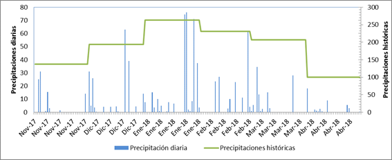 De acuerdo a la Sección de Agrometeorología de la EEA Famaillá, la campaña 2017-2018 tuvo un comportamiento agrometeorológico cálido y húmedo en términos generales. A comienzos de noviembre del 2017, el perfil del suelo se encontraba con humedad edáfica y profundidad de napa normal y suficiente para comenzar la siembra, consecuencia de los 75 mm de precipitación ocurridos en la primera decena del mes. Sin embargo, en muchas zonas de la provincia, se esperaron las precipitaciones de diciembre para garantizar mayor humedad en el suelo. Ese mes alcanzó los valores normales de precipitación, aunque la distribución temporal pudo afectar la planificación de las labores debido a que el 60% de la lluvia mensual se concentró en la última decena de diciembre. Enero del 2018 cerró con una precipitación superior a la normal, pero este volumen hídrico difícilmente pudo ser aprovechado por las raíces, ya que ocurrió en tres eventos que superaron los 70 mm/día, provocando daño en los suelos por escorrentía y erosión. Febrero, marzo y abril de 2018 se destacaron por los bajos volúmenes de precipitación alcanzados, la disminución de la humedad edáfica y el aumento de profundidad de la napa freática. Las pérdidas de agua del sistema estimado por la evapotranspiración alcanzaron valores muy superiores a los normales en febrero, superiores en marzo y normales en abril. En toda la campaña agrícola se destacó la gran amplitud térmica e inestabilidad del aire.