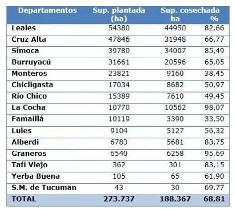 La suma de superficie cosechada en todos los departamentos de Tucumán registra un total de 188.367 ha, lo que representa el 68,81% en la provincia. Con este nivel de avance, y de no producirse lluvias de significación, se proyecta la finalización de esta zafra hacia los primeros días de octubre como fecha media para la mayor parte del parque industrial sucroalcoholero.