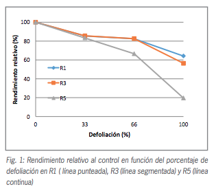 En general se observó una disminución en el rendimiento a medida que se incrementó el nivel de defoliación en todos los estados fenológicos evaluados; la mayor incidencia se detectó en las defoliaciones efectuadas en estado R5.