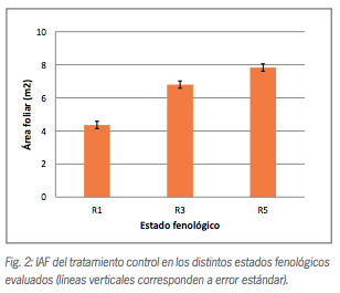 Los tratamientos fueron combinaciones de cuatro niveles de defoliación en tres momentos: 0% (control), 33%, 66% y 100% en R1 (inicio de floración), R3 (inicio de crecimiento de vainas) y R5 (inicio de llenado de granos). Para lograr los niveles de defoliación 33%, 66% y 100% se removieron manualmente 1, 2 y los 3 foliolos de todas las hojas de las plantas respectivamente. El diseño fue en bloques al azar con 3 repeticiones, las unidades experimentales fueron de 6 m2 (4 surcos de 3 m de largo).
