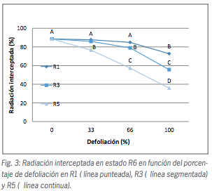 Se observó una relación lineal entre la radiación interceptada posteriormente a la defoliación en cada estado fenológico y el rendimiento, por lo que la disminución de la intercepción de la radiación debido a la defoliación simulada por insectos tuvo una fuerte influencia en el rendimiento (a mayor defoliación, menor intercepción por lo tanto menor rendimiento). Los distintos tratamientos provocaron diferencias significativas en la radiación interceptada en R6 (Fig. 3). Los tres niveles de defoliación (en R5), el 66 y 100% en (R3) y el 100% en R1 provocaron una disminución significativa en la intercepción de radiación. Estos resultados confirman que la capacidad de recuperación del área foliar disminuye con el desarrollo del cultivo hasta el estado fenológico R5 a partir del cual no se producen nuevas hojas.