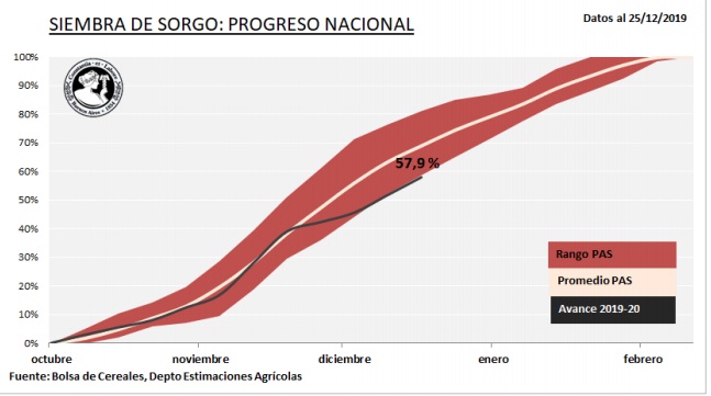 Durante los últimos quince días las lluvias registradas permitieron mejorar las reservas hídricas en los lotes, brindando fluidez a las tareas de siembra. Los mayores progresos se registraron en las provincias de Córdoba, Chaco, Santa Fe y Buenos Aires. A la fecha el avance de siembra se ubica en 57,9 % de un área estimada para la campaña 2019/20 en 750.000 Ha., un 2,8 % superior al ciclo previo (Superficie campaña 2018/19: 730.000 Ha.). El avance interquincenal fue de 12,4 puntos porcentuales y se registra una demora interanual de 3,3 puntos.