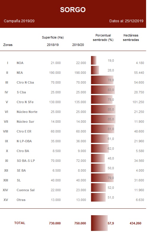 Gran parte de los cuadros sembrados ya se encuentran diferenciando hojas bajo buenas condiciones sanitarias y reservas hídricas irregulares. Sobre la región del CentroNorte de Santa Fe, las últimas lluvias mejoraron la condición de los cuadros de sorgo más adelantados. Hacia la zona Centro-Este de Entre Ríos aún se registran lotes puntuales con encharcamientos, mientras continua la siembra de lotes tardíos. Hacia las regiones NOA y NEA, la incorporación de cuadros comienza a tomar impulso. En las zonas Oeste de Buenos AiresNorte de La Pampa, Cuenca del Salado y el Centro de Buenos Aires la siembra avanza sobre lotes con niveles de humedad adecuada en los primeros centímetros del perfil. En la provincia de Córdoba, los cuadros más adelantados del cereal ya se encuentran transitando la etapa fenológica de floración con reservas hídricas moderadas. Los lotes más adelantados transitan estadios reproductivos.