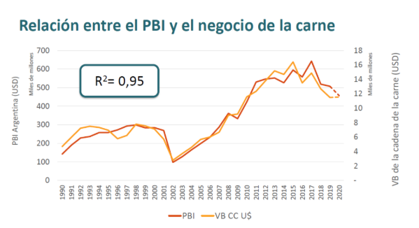 “Como la mayor parte de la carne vacuna argentina se vende en el mercado interno, existe un correlación muy elevada entre la evolución del Producto Bruto Interno (PBI) y la facturación de la cadena cárnica”, explicó José para luego indicar que la fortaleza del negocio exportador es condición necesaria para sostener los precios mínimos de la hacienda.