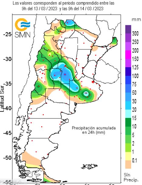 Según los registros de las últimas 24 horas del Servicio Meteorológico Nacional (SMN) -los acumulados corresponden al período entre las 9 del lunes 13 y la misma hora del martes 14-, donde los mayores registros se dieron en Córdoba y San Luis, aunque también hubo importantes descargas en el centro y noroeste de Buenos Aires.