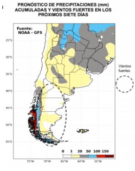 Lluvias pronosticadas. Según la ORA, hasta el viernes se esperan lluvias debido al pasaje de un frente de baja presión seguido del avance de un sistema frontal en el centro y norte del país. Serían de diversa intensidad en Buenos Aires, La Pampa, Mendoza, San Luis, San Juan, Córdoba, Santa Fe, Entre Ríos, y provincias del NOA y el NEA. En este periodo también podrían darse eventos aislados en Patagonia y en sus zonas cordilleranas.