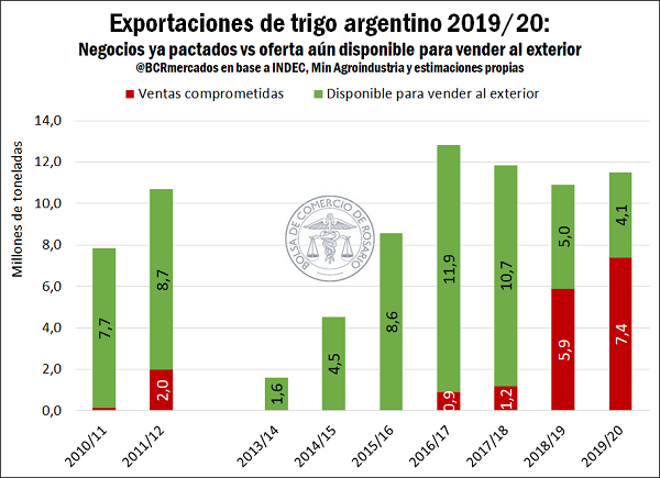 Al cierre de octubre, ya se anotaron ventas por las dos terceras parte de las exportaciones totales de trigo proyectadas para la campaña 2019/20, que recién comienza a cosecharse en Argentina. Se trata de un total de 7,4 millones de toneladas comprometidas al exterior, de un total de despachos al exterior proyectado para toda la campaña que va de diciembre 2019 a noviembre 2020 de 11,5 millones de toneladas.