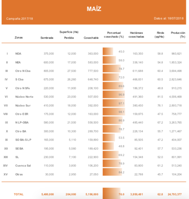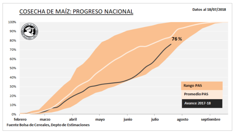 Durante la última semana la recolección de lotes de maíz con destino grano comercial avanzó a buen ritmo en gran parte de las zonas PAS. Los mayores adelantos se registran en las provincias de Chaco y Córdoba, donde las labores se concentraron sobre lotes sembrados durante el verano. Los volúmenes que se vienen cosechando continúan siendo más bajos que las expectativas iniciales en las regiones del centro del área agrícola nacional. Los rendimientos medios se encuentran entre 14 y 18 qq/Ha por debajo de los relevados en la misma fecha de la campaña previa, producto de la restricción hídrica sufrida por los cuadros durante el período crítico.