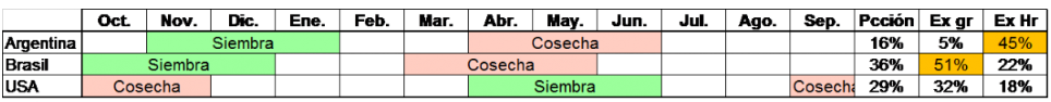 SOJA: A partir de marzo comienza a fluir la soja desde Brasil, a la que se suma la soja de Argentina en abril, y desde la segunda quincena de septiembre ya comienza a salir la soja de Estados Unidos, cada una de estas cosechas se distribuye durante tres meses desde su inicio, solo julio, agosto, diciembre, enero y febrero, son meses en los que no hay cosecha activa, pero hay disposición de mercadería nueva desde Sudamérica en julio y agosto, y desde Estados Unidos en diciembre, enero y febrero. Julio, agosto y enero, febrero son meses claves para la definición de rendimiento en Estados Unidos y Sudamérica respectivamente, los meses de mayor tensión en el mercado de soja, pero, pasado ese tiempo y el riesgo de pérdidas, el mercado se queda tranquilo y ofrece lo mínimo necesario, para proveerse de esta oleaginosa.