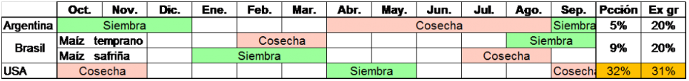Si vamos al mercado de maíz argentino, enfocado en la exportación de maíz como grano, tenemos un trimestre de oportunidad para capturar compradores que busquen mercadería nueva entre abril y junio, luego ingresa el amplio caudal de maíz brasilero, e inmediatamente después comienza el ingreso del maíz estadounidense, lo que nos deja como segunda y tercera alternativa de compras de un grano sin ningún valor agregado, con precios que buscan máximos internacionales, en el momento de mayor presión de cosecha sudamericana, entre la safriña de Brasil y la cosecha tardía de Argentina.