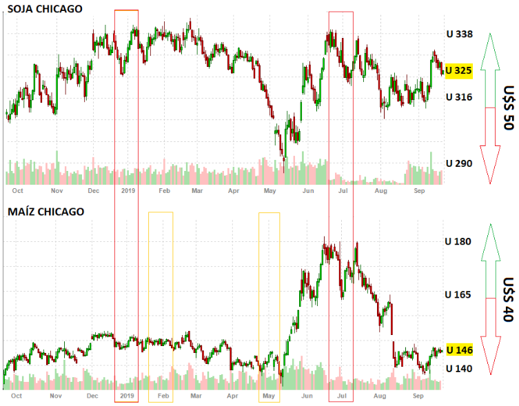 Entre los precios mínimos y máximos de soja y maíz, se atravesaron fluctuaciones de U$S 50 y 40/TN respectivamente, estando la soja por encima de la media de precios de este año, y el maíz por debajo de la media de precios.