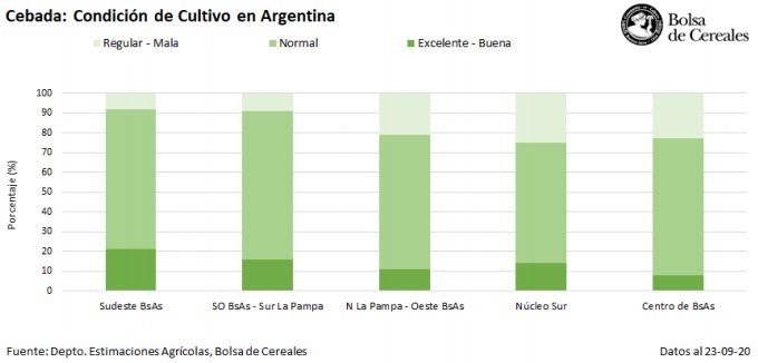 Por otra parte, sobre el centro-este y sur del área agrícola, el cereal continúa avanzando con su etapa de encañazón, mostrando signos de recuperación tras los daños provocados por las intensas heladas a lo largo del invierno. Durante los últimos 15 días se informaron aplicaciones para el tratamiento de enfermedades tales como mancha en red sobre el norte de La Pampa, el oeste y el sudeste bonaerense y el Centro-Norte de Santa Fe.