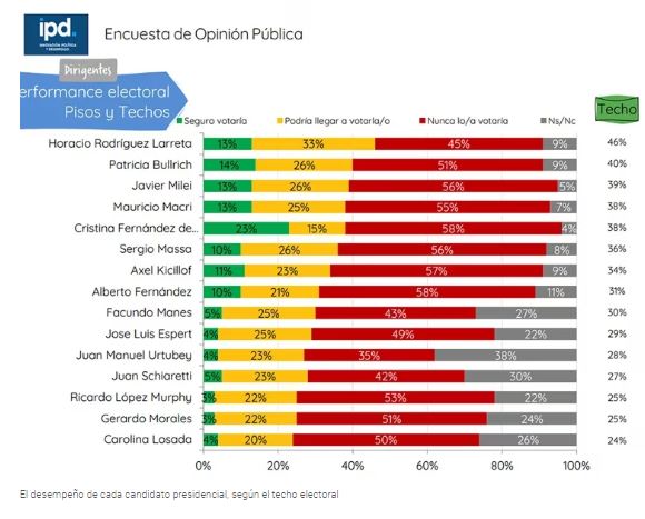 También, el relevamiento midió la intención de voto. Aquí, Rodríguez Larreta vuelve a ser el dirigente político mejor posicionado ante el próximo proceso electoral, con un techo electoral del 46%. Poco más atrás le sigue, nuevamente, Patricia Bullrich (42%), seguida por Milei (39%) y Macri (38%).
