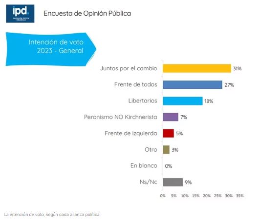 Al medirse la opinión según las alianzas políticas y coaliciones, en el segundo turno electoral, JxC gana la elección con el 31% de los votos, seguido por el FdT (27%) y los libertarios (18%).