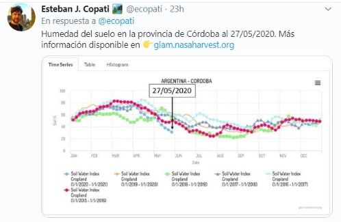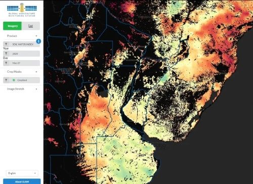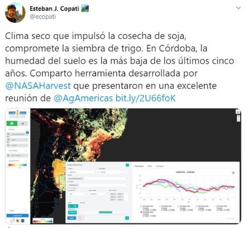 De acuerdo a una imagen de NASA Harvest, el consorcio de la agencia espacial norteamericana cuyo objetivo es promover la adopción de análisis de imágenes satelitales focalizadas en la agricultura mundial, la humedad superficial en el suelo, no en profundidad, se encuentra en la provincia de Córdoba en el nivel más bajo en los últimos cinco años.