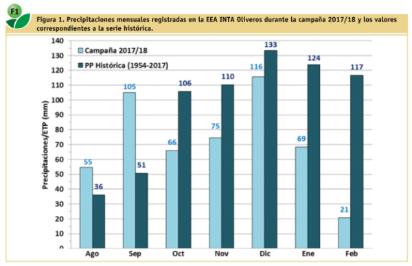En este sentido, la Figura 1 muestra las anomalías que se registraron en las precipitaciones mensuales en la Estación Experimental Agropecuaria INTA Oliveros. A la salida del invierno y comienzos de la primavera, hubo precipitaciones mayores a las históricas que permitieron la implantación del maíz de primera con un perfil del suelo cargado; en cambio, a partir de octubre los registros siempre estuvieron por debajo, llegando a su punto mínimo durante los meses de enero y febrero.