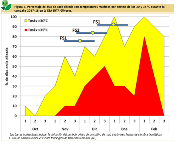 En la región sur de la provincia de Santa Fe, como en gran parte de la zona núcleo pampeana, otra limitante climática importante para el maíz de primera es la ocurrencia de eventos prolongados de altas temperaturas (por encima de 30 y 35° C), conocidos popularmente “golpes de calor”. Las temperaturas por encima de 30° registradas durante la floración, afectan procesos muy sensibles como la viabilidad del polen, el crecimiento del carpelo y las divisiones celulares, limitando el número final de granos cuajados y el peso potencial del mismo. Temperaturas por encima de los 35°C, además, producen un grado variable de aborto de granos durante los días posteriores a la fecundación y afectan el índice de cosecha final.