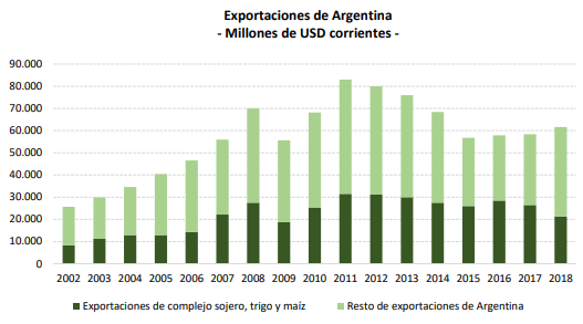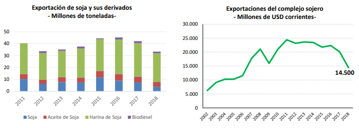 Complejo sojero. Debido a la fuerte sequía de la campaña pasada, las exportaciones se derrumbaron en 8,8 millones de toneladas, pasando de 42,2 millones de toneladas en 2017 a 33,4 millones de toneladas en 2018, lo cual implica una merma del 21 por ciento.