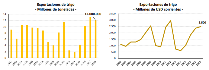 Trigo. En 2018, las exportaciones cayeron ocho por ciento, alcanzando un volumen de 12 millones de toneladas. Más allá de la caída, es el segundo registro más alto de las últimas dos décadas.
