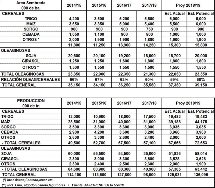 Las proyecciones actuales de la próxima campaña 2018-2019 permiten pensar en 37,3 millones de hectáreas sembradas (de las cuales 5,5 millones de hectáreas corresponden a maíz y 18,7 millones a soja) Ver cuadro: