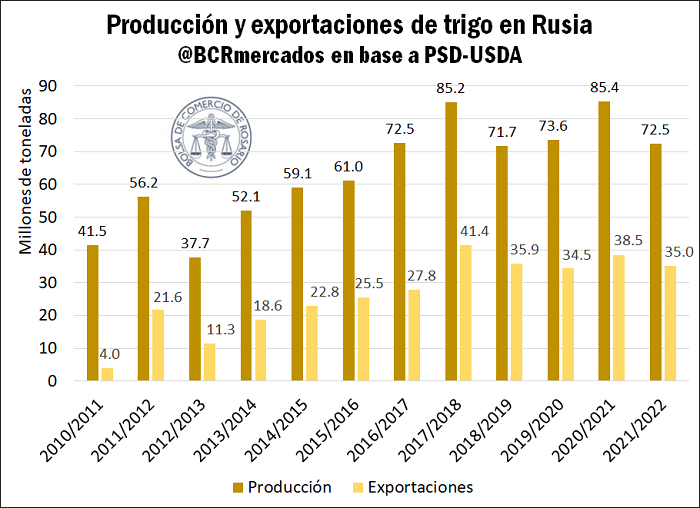 No obstante, la gran sorpresa de este jueves vino con la publicación del Informe de Oferta y Demanda Agrícola Mundial (WASDE) del Departamento de Agricultura de los Estados Unidos (USDA), donde el organismo proyectó una cosecha de trigo 2021/22 de 72,5 Mt para la Federación Rusa, una baja que supera el 15% respecto de la campaña anterior como consecuencia de las temperaturas poco favorables y escasa humedad de suelos. Esta reducción de cosecha en el país más extenso del mundo es el principal determinante en la baja mundial de la producción de trigo.