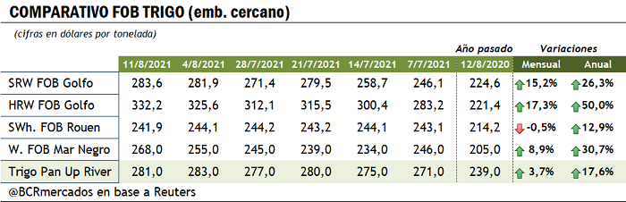 Con este panorama, el trigo en Chicago mostró una suba de casi 10 dólares el jueves, y espera cerrar la semana en torno a los US$ 277/t, una suba del casi el 6% en apenas 4 jornadas. De esta manera, el trigo sube un 7% en agosto y más de un 21% desde julio para la plaza norteamericana. La plaza local se subió a las alzas semanales y cerró en torno a los US$ 230/t. De esta manera, en la semana los precios escalan un 4,8%, consolidando un agosto con subas superiores al 12,4%. Al compás de las alzas de precios, hubo más posiciones abiertas de compra y más compradores activos.