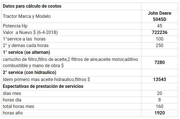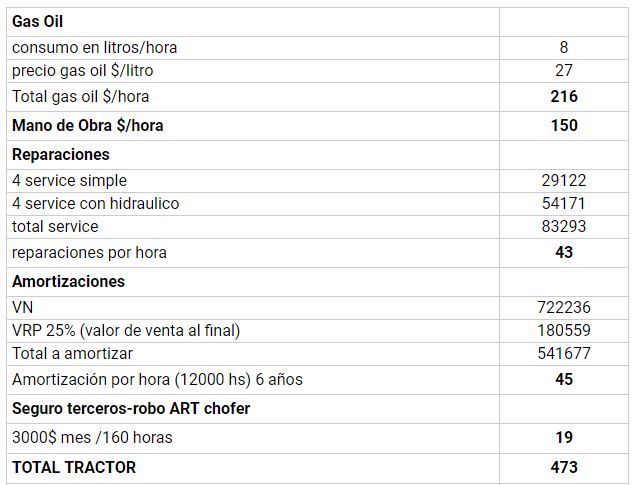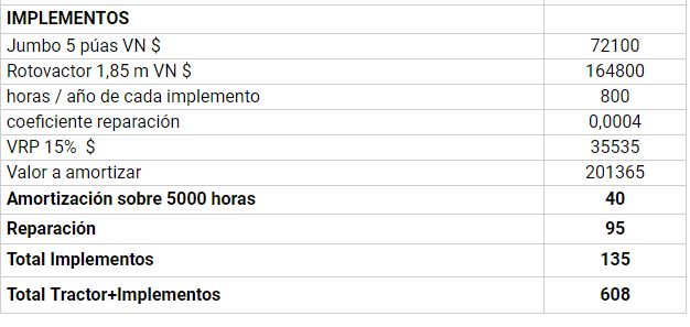 En los cálculos de amortizaciones descontamos el VRP valor residual pasivo que es simplemente el valor del “fierro” en su venta final. Aquí es un valor en % que es mayor para máquinas con motor que en los implementos. Finalmente, en estos implementos se toma un valor por tabla para reparaciones y mantenimiento.