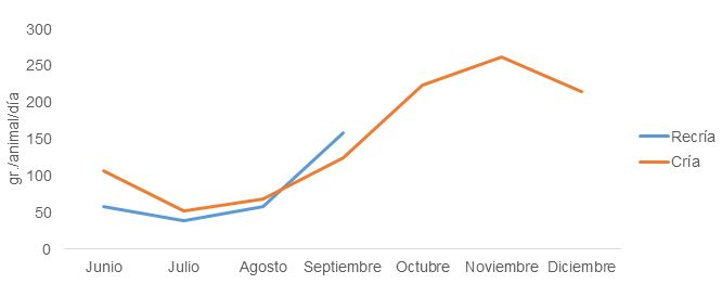 El seguimiento del consumo se realizó durante la recría de vaquillas sobre pastura degradada y sobre un rodeo de cría en campo natural. En la Figura 1 se presenta el consumo de bloques de ambas categorías. Las vaquillas de reposición en etapa de recría incrementaron el consumo a la salida del invierno. En las vacas de cría se observó el mismo patrón. El consumo durante la época de parición y lactancia (octubre, noviembre, diciembre) fue el doble respecto de la época de gestación.