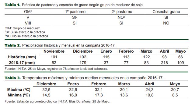 Romero y Mattera (2013) obtuvieron una producción de MS y rendimiento de grano que duplica lo obtenido en este trabajo, sembrando soja de GM VII y VIII con uso doble propósito (un pastoreo) el 16 de diciembre. La diferencia de producción de forraje puede atribuirse a la mayor disponibilidad de fósforo y precipitaciones durante el verano en Rafaela (53 mg/kg; 381 mm), comparado con 25 de Mayo (7 mg/kg de fósforo entre suelo y fertilizante; 197 mm). La diferencia de rendimiento de grano, puede deberse a la mayor disponibilidad de fósforo y temperatura media de otoño en Rafaela (19,6 ºC) con respecto a 25 de Mayo (14,7 ºC).